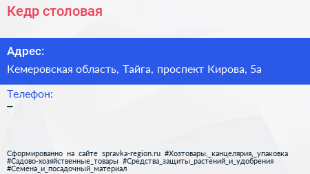 Кедр, столовая по адресу Кемеровская область, Тайга, проспект Кирова, 5а в дальнейшем Организация, размещена в следующих категориях: