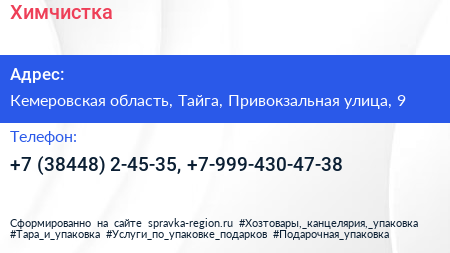 Химчистка по адресу Кемеровская область, Тайга, Привокзальная улица, 9 в дальнейшем Организация, размещена в следующих категориях: