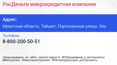 РосДеньги, микрокредитная компания по адресу Иркутская область, Тайшет, Партизанская улица, 56а в дальнейшем Организация, размещена в следующих категориях: