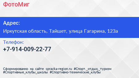 ФотоМиг по адресу Иркутская область, Тайшет, улица Гагарина, 123а в дальнейшем Организация, размещена в следующих категориях: