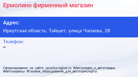 Ермолино, фирменный магазин по адресу Иркутская область, Тайшет, улица Чапаева, 28 в дальнейшем Организация, размещена в следующих категориях: