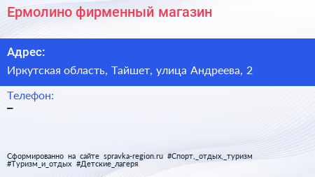 Ермолино, фирменный магазин по адресу Иркутская область, Тайшет, улица Андреева, 2 в дальнейшем Организация, размещена в следующих категориях: