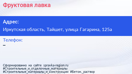 Фруктовая лавка по адресу Иркутская область, Тайшет, улица Гагарина, 125а в дальнейшем Организация, размещена в следующих категориях: