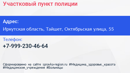 Участковый пункт полиции по адресу Иркутская область, Тайшет, Октябрьская улица, 55 в дальнейшем Организация, размещена в следующих категориях:
