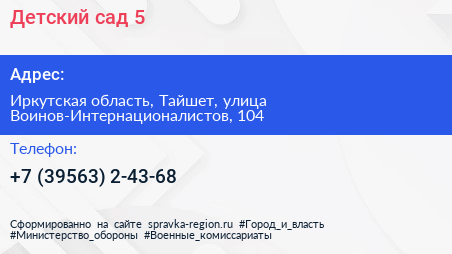 Детский сад №5 по адресу Иркутская область, Тайшет, улица Воинов-Интернационалистов, 104 в дальнейшем Организация, размещена в следующих категориях:
