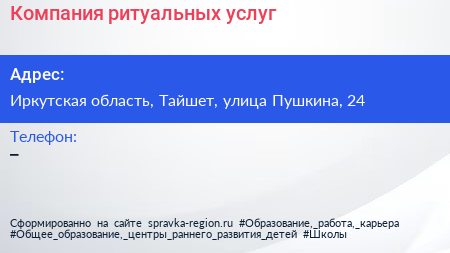 Компания ритуальных услуг по адресу Иркутская область, Тайшет, улица Пушкина, 24 в дальнейшем Организация, размещена в следующих категориях: