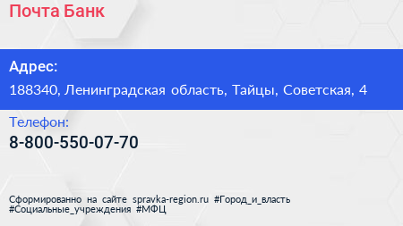 Почта Банк по адресу 188340, Ленинградская область, Тайцы, Советская, 4 в дальнейшем Организация, размещена в следующих категориях: