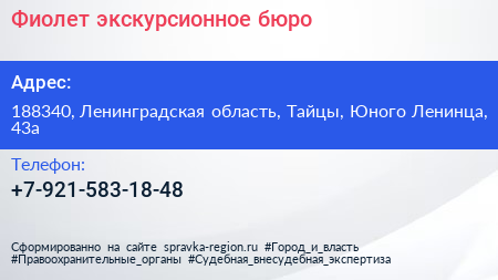 Фиолет, экскурсионное бюро по адресу 188340, Ленинградская область, Тайцы, Юного Ленинца, 43а в дальнейшем Организация, размещена в следующих категориях: