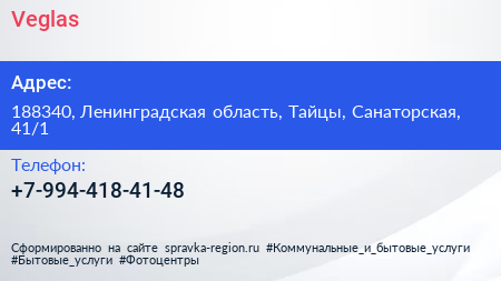 Veglas по адресу 188340, Ленинградская область, Тайцы, Санаторская, 41/1 в дальнейшем Организация, размещена в следующих категориях: