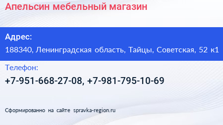 Апельсин, мебельный магазин по адресу 188340, Ленинградская область, Тайцы, Советская, 52 к1 в дальнейшем Организация, размещена в следующих категориях: