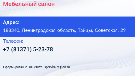 Мебельный салон по адресу 188340, Ленинградская область, Тайцы, Советская, 29 в дальнейшем Организация, размещена в следующих категориях: