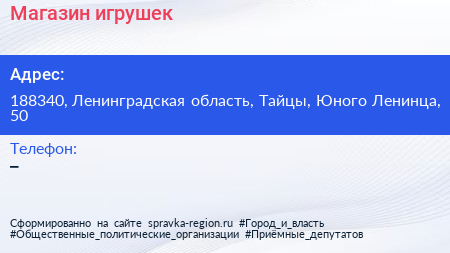 Магазин игрушек по адресу 188340, Ленинградская область, Тайцы, Юного Ленинца, 50 в дальнейшем Организация, размещена в следующих категориях: