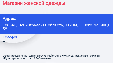 Магазин женской одежды по адресу 188340, Ленинградская область, Тайцы, Юного Ленинца, 59 в дальнейшем Организация, размещена в следующих категориях: