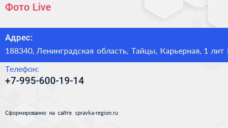Фото-Live по адресу 188340, Ленинградская область, Тайцы, Карьерная, 1 лит П в дальнейшем Организация, размещена в следующих категориях: