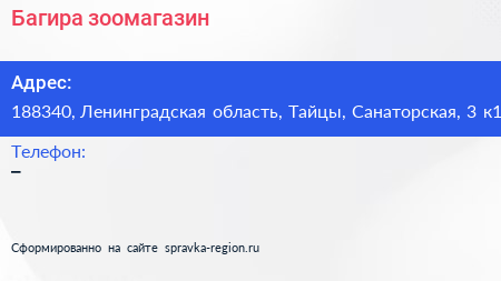 Багира, зоомагазин по адресу 188340, Ленинградская область, Тайцы, Санаторская, 3 к1 в дальнейшем Организация, размещена в следующих категориях: