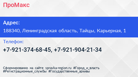 ПроМакс по адресу 188340, Ленинградская область, Тайцы, Карьерная, 1 в дальнейшем Организация, размещена в следующих категориях: