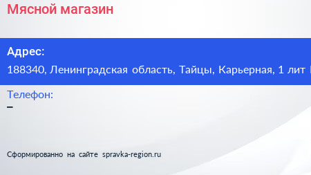 Мясной магазин по адресу 188340, Ленинградская область, Тайцы, Карьерная, 1 лит П в дальнейшем Организация, размещена в следующих категориях: