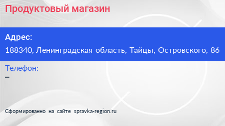 Продуктовый магазин по адресу 188340, Ленинградская область, Тайцы, Островского, 86 в дальнейшем Организация, размещена в следующих категориях: