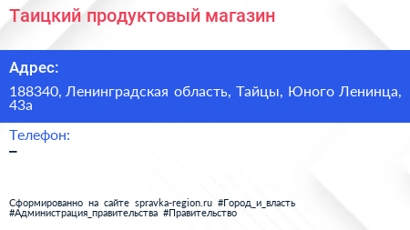 Таицкий, продуктовый магазин по адресу 188340, Ленинградская область, Тайцы, Юного Ленинца, 43а в дальнейшем Организация, размещена в следующих категориях: