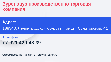 Вурст хауз, производственно-торговая компания по адресу 188340, Ленинградская область, Тайцы, Санаторская, 41 в дальнейшем Организация, размещена в следующих категориях: