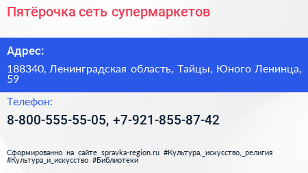 Пятёрочка, сеть супермаркетов по адресу 188340, Ленинградская область, Тайцы, Юного Ленинца, 59 в дальнейшем Организация, размещена в следующих категориях: