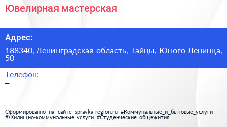 Ювелирная мастерская по адресу 188340, Ленинградская область, Тайцы, Юного Ленинца, 50 в дальнейшем Организация, размещена в следующих категориях: