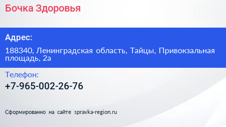 Бочка Здоровья по адресу 188340, Ленинградская область, Тайцы, Привокзальная площадь, 2а в дальнейшем Организация, размещена в следующих категориях: