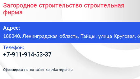 Загородное строительство, строительная фирма по адресу 188340, Ленинградская область, Тайцы, улица Круговая, 6 в дальнейшем Организация, размещена в следующих категориях: