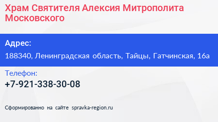 Храм Святителя Алексия Митрополита Московского по адресу 188340, Ленинградская область, Тайцы, Гатчинская, 16а в дальнейшем Организация, размещена в следующих категориях: