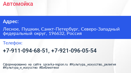 Автомойка по адресу Лесное, Пушкин, Санкт-Петербург, Северо-Западный федеральный округ, 196632, Россия в дальнейшем Организация, размещена в следующих категориях: