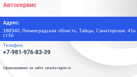 Автосервис по адресу 188340, Ленинградская область, Тайцы, Санаторская, 41а ст16 в дальнейшем Организация, размещена в следующих категориях: