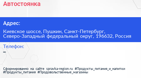 Автостоянка по адресу Киевское шоссе, Пушкин, Санкт-Петербург, Северо-Западный федеральный округ, 196632, Россия в дальнейшем Организация, размещена в следующих категориях: