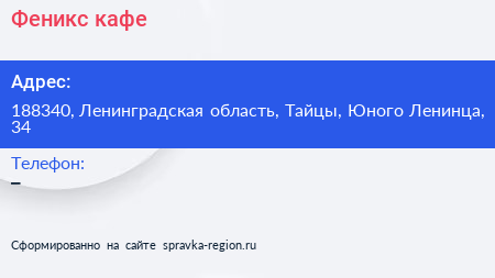 Феникс, кафе по адресу 188340, Ленинградская область, Тайцы, Юного Ленинца, 34 в дальнейшем Организация, размещена в следующих категориях:
