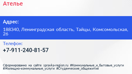 Ателье по адресу 188340, Ленинградская область, Тайцы, Комсомольская, 26 в дальнейшем Организация, размещена в следующих категориях: