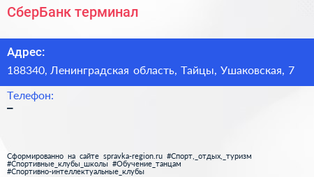 СберБанк, терминал по адресу 188340, Ленинградская область, Тайцы, Ушаковская, 7 в дальнейшем Организация, размещена в следующих категориях: