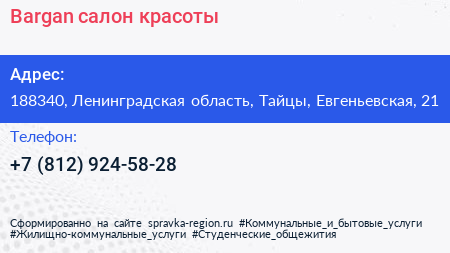 Bargan, салон красоты по адресу 188340, Ленинградская область, Тайцы, Евгеньевская, 21 в дальнейшем Организация, размещена в следующих категориях: