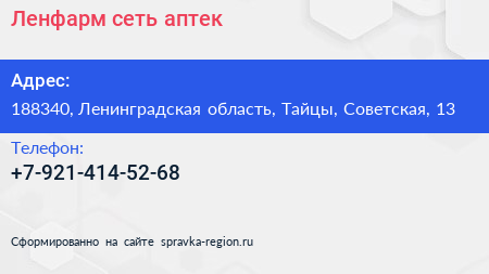 Ленфарм, сеть аптек по адресу 188340, Ленинградская область, Тайцы, Советская, 13 в дальнейшем Организация, размещена в следующих категориях: