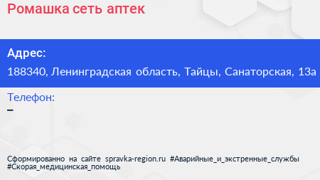 Ромашка, сеть аптек по адресу 188340, Ленинградская область, Тайцы, Санаторская, 13а в дальнейшем Организация, размещена в следующих категориях: