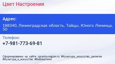 Цвет Настроения по адресу 188340, Ленинградская область, Тайцы, Юного Ленинца, 50 в дальнейшем Организация, размещена в следующих категориях: