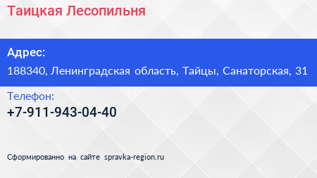 Таицкая Лесопильня по адресу 188340, Ленинградская область, Тайцы, Санаторская, 31 в дальнейшем Организация, размещена в следующих категориях: