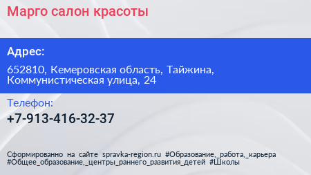 Марго, салон красоты по адресу 652810, Кемеровская область, Тайжина, Коммунистическая улица, 24 в дальнейшем Организация, размещена в следующих категориях: