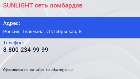 SUNLIGHT, сеть ломбардов по адресу Торговый центр «Ока», Линия Обороны, Простоквашино, Колпино, Тельмановское городское поселение, Тосненский район, Санкт-Петербург, Северо-Западный федеральный округ, 187032, Россия в дальнейшем Организация, размещена в следующих категориях:
