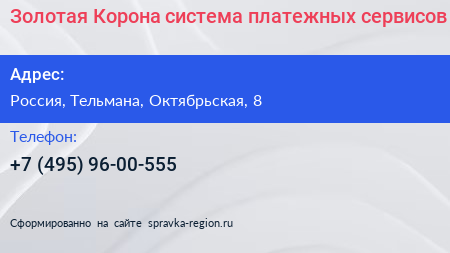 Золотая Корона, система платежных сервисов по адресу Торговый центр «Ока», Линия Обороны, Простоквашино, Колпино, Тельмановское городское поселение, Тосненский район, Санкт-Петербург, Северо-Западный федеральный округ, 187032, Россия в дальнейшем Организация, размещена в следующих категориях: