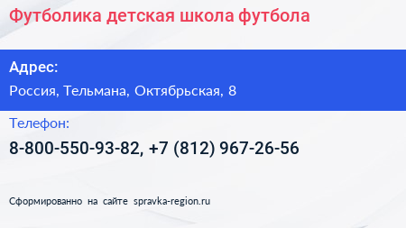 Футболика, детская школа футбола по адресу Торговый центр «Ока», Линия Обороны, Простоквашино, Колпино, Тельмановское городское поселение, Тосненский район, Санкт-Петербург, Северо-Западный федеральный округ, 187032, Россия в дальнейшем Организация, размещена в следующих категориях:
