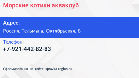 Для связи с организацией воспользуйтесь номером телефона: +7-921-442-82-83. Пн: c 15:00-21:00, Вт: c 15:00-21:00, Ср: c 15:00-21:00, Чт: c 15:00-21:00, Пт: c 15:00-21:00, Сб: c 10:00-19:00, Вс: c 10:00-19:00, вы можете обратиться в эту организацию.