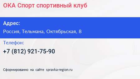 ОКА-Спорт, спортивный клуб по адресу Торговый центр «Ока», Линия Обороны, Простоквашино, Колпино, Тельмановское городское поселение, Тосненский район, Санкт-Петербург, Северо-Западный федеральный округ, 187032, Россия в дальнейшем Организация, размещена в следующих категориях: