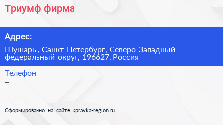 Триумф, фирма по адресу Шушары, Санкт-Петербург, Северо-Западный федеральный округ, 196627, Россия в дальнейшем Организация, размещена в следующих категориях: