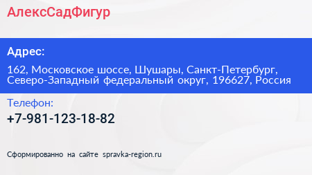 АлексСадФигур по адресу 162, Московское шоссе, Шушары, Санкт-Петербург, Северо-Западный федеральный округ, 196627, Россия в дальнейшем Организация, размещена в следующих категориях: