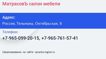 МатрасовЪ, салон мебели по адресу Торговый центр «Ока», Линия Обороны, Простоквашино, Колпино, Тельмановское городское поселение, Тосненский район, Санкт-Петербург, Северо-Западный федеральный округ, 187032, Россия в дальнейшем Организация, размещена в следующих категориях: