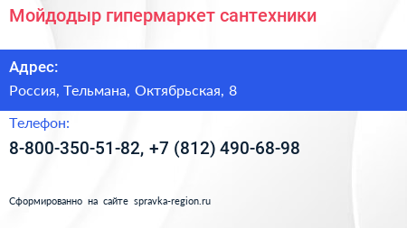 Мойдодыр, гипермаркет сантехники по адресу Торговый центр «Ока», Линия Обороны, Простоквашино, Колпино, Тельмановское городское поселение, Тосненский район, Санкт-Петербург, Северо-Западный федеральный округ, 187032, Россия в дальнейшем Организация, размещена в следующих категориях: